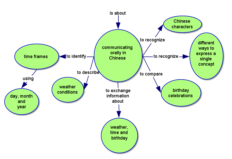 | Sample Performance Assessments: 1. Assess students current level vocabulary related to this unit of study (oral language). 2. Given the characters for year, month, day and January to December, students match the character with the corresponding pinyin. (1.2.N.R.a) 3. Identify weather conditions using pictures. (1.1.N.SL.b) 4. Describe the weather/Give a weather report for a given day. (1.1.N.SL.b) 5. In pairs, students ask about and respond to the current date and birthday. (1.1.N.SL.i, 1.3.N.S.b) 6. Draw a picture showing a birthday celebration in the USA and China. (2.2.N.F.d, 4.2.N.a) | Identifying Describing Comparing |