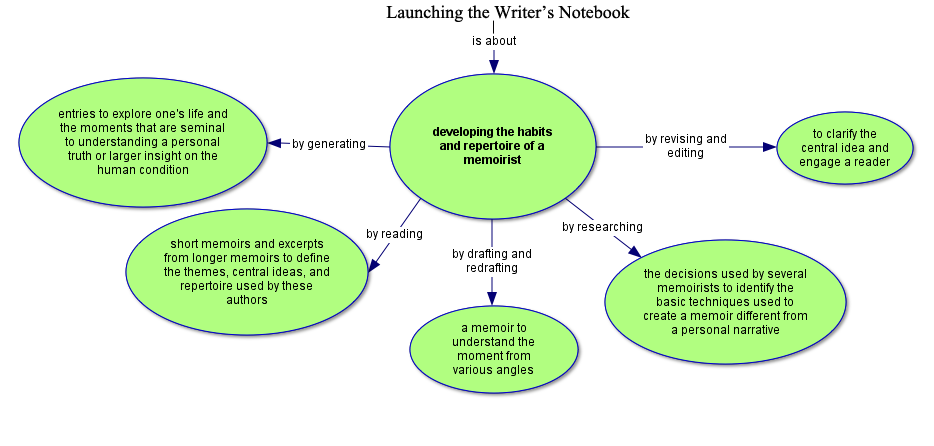 | Pre-Unit Assessment Task: In order to determine your understanding of memoir writing at this point, please write a short essay that answers the essential questions. Use specific examples from any memoir, personal narrative, poetry, or other genre you have written in the past. Essential Questions: 1. Why is it necessary for a memoirist to discover the meaning of the memoir? 2. Is a memoir a confession or a thoughtful insight? 3. What are memoirists’ basic and essential decisions that make them different from storytellers? Mid-Unit Assessment Task: What habit or attitude is essential to become a memoirist? Reread your writer’s notebook and identify an attitude that influenced and increased your living like a memoirist. What strategies or readings influenced your choice? Select a single entry that best demonstrates your view of this essential attitude. Explain how using this attitude enabled or changed the way you think about writing or think about yourself as a writer. Students will select a single entry that best demonstrates their view of this essential attitude. Explain how using this attitude enabled or changed the way you think about writing or think about yourself as a writer. Post-Unit Assessment Task: What engages readers in the public and/or private lives of individuals? After reading memoirs and memoir excerpts and experimenting with the habits, strategies, and attitudes of memoirists, generate a variety of memoir drafts to discover moments that matter. Through self-exploration of those moments as well as the identification of ordinary and emblematic moments, define an aspect of your public and/or private life. Then write a memoir that expresses this aspect and demonstrates use of memoirists’ techniques. Revise and edit the memoir to meet a publishing standard. Write a reflection that examines the ways your writing has been impacted by experimenting with and developing a memoir for publication. Submit the memoir for publication. | Developing a repertoire of cognitive and meta-cognitive skills and strategies for inquiry and decision-making. Engaging in collaborative partnerships to maximize individual and collective learning. Experiencing activities, in order to use thinking skills and strategies to increase self-initiation, decision-making, independence, and responsibility. Observing, experimenting, planning and implementing a plan, in order to become aware of the nature of thinking, as well as the attitudes that effect change and develop the voice of a writer. |