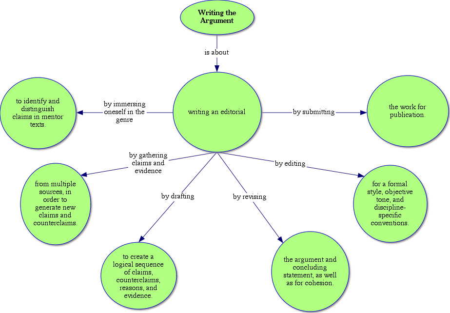 1. Write arguments to support claims in an analysis of substantive topics or texts, using valid reasoning and relevant and sufficient evidence. W.11-12.1. Write arguments to support claims in an analysis of substantive topics or texts, using valid reasoning and relevant and sufficient evidence. W.11-12.1a. Introduce precise, knowledgeable claim(s), establish the significance of the claim(s), distinguish the claim(s) from alternate or opposing claims, and create an organization that logically sequences claim(s), counterclaims, reasons, and evidence. W.11-12.1b. Develop claim(s) and counterclaims fairly and thoroughly, supplying the most relevant evidence for each while pointing out the strengths and limitations of both in a manner that anticipates the audience’s knowledge level, concerns, values, and possible biases. W.11-12.1c. Use words, phrases, and clauses as well as varied syntax to link the major sections of the text, create cohesion, and clarify the relationships between claim(s) and reasons, between reasons and evidence, and between claim(s) and counterclaims. W.11-12.1d. Establish and maintain a formal style and objective tone while attending to the norms and conventions of the discipline in which they are writing. W.11-12.1e. Provide a concluding statement or section that follows from and supports the argument presented. Production and Distribution of Writing