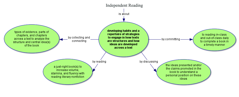 | Overarching Questions What reading and thinking habits do I have or will I learn by stretching my reading in fiction? What strategies do I use to engage in reading, in order to explore central ideas and arguments posed in fiction? What are the basic elements and structures of fiction? How can I use knowledge about these elements and structures to enable myself to engage increasingly complex texts, while also identifying an author’s multiple purposes in a text? Enduring Understandings Independent readers build a repertoire of reading habits and strategies to engage with the ideas and meanings in fiction. They develop an understanding of how the texts work to express the central ideas developed across a text. In personal reading and peer conversations, they build their understanding of how fiction texts are written, at the same time they build an understanding of the ideas and evidence the writer uses to inform or persuade a reader. |