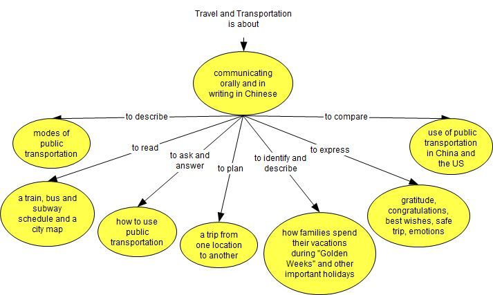 | In this unit of study, students identify various modes of public transportation used in Chinese daily life and for vacations. They learn to read a schedule and make plans to travel from one location to another. Students compare the use of public transportation in USA and China. Students explore how families in both countries plan vacations. In addition they learn to offer holiday greetings and express personal gratitude for help received from others while traveling. |