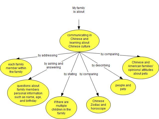 | 1. How do families in China compare to families in the USA? 2. How do I describe my family members and their relationship to each other? 3. What does the Zodiac sign represent? 4. What is the attitude of Chinese and American families toward pets? | - family members: mother, father, younger and older sister, younger and older brother, grandparents