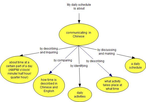 Summative assessment - Assessment 4.5: Interpretive Reading and Presentational Writing: Reading Comprehension: students to answer questions regarding a Chinese student's daily schedule, and have them compare the differences with their own by writing their own schedule. (1.2.N.R.c , 1.3.W.a, 4.2.N.a; 4.2.N.d)