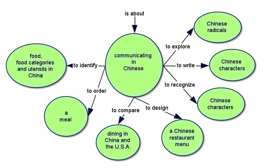 | Sample Performance Assessments: 1. Assess students' current level vocabulary related to this unit of study (oral language). 2. Create and label your favorite Chinese meal using a word bank in both Pinyin and characters. (1.2.N.R.a, 2.1.N.F.c) 3. Create a Chinese restaurant menu using a word bank in both pinyin and characters.(1.3.N.W.a, 2.1.N.F.c) 4. Create and orally present a skit ordering a meal in a Chinese restaurant. (1.1.N.SL.i) 5. Using a Venn diagram, students compare dining in the USA and China. (4.2.N.a) 6. Given Chinese characters students match the pictures with the characters. (1.2.N.R.a) | Identifying Describing Comparing |